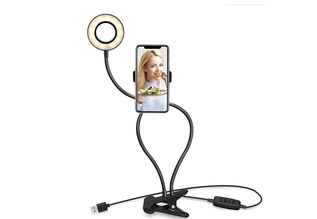 2.Masa klipsi halkası ışığı herhangi bir açıda ayarlanabilir ve telefonla batmaz.Ve telefon tutuculu başka bir inç kol daha var, telefon tutucu akıllı telefonların çoğu için uygun olan 3,5 "genişliğe kadar uzatılabilir.